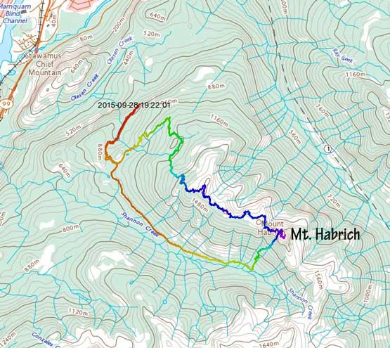 Upon seeing a high pressure system building up over the province Vlad and I had been talking about making an ascent of a “harder” objective. It was a little bit difficult to finalize the choice but eventually we decided to downgrade our ambition and picked Mt. Habrich. This is the lowest among the three peaks accessible from the upper Sea-to-Sky Gondola station, but considered as the biggest prize by many parties. The least technical route is the NE Ridge (Class 3-4), but relatively hard to access and involves fair a bit of bush thrashing. Our inspiration mostly came from Simon’s excellent trip report, an “old school Class 4” route on the “NNW Face”. Having already ascended the nearby Sky Pilot Mountain and The Copilot earlier this month I was excited to make an attempt at this harder neighbour.