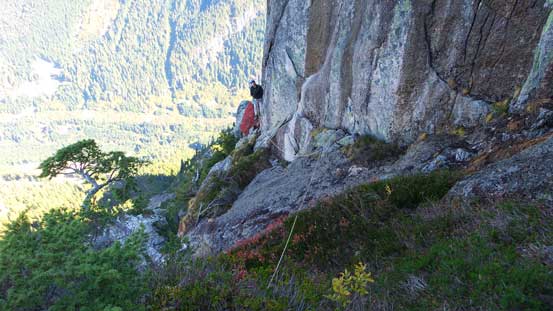 Despite the sunny weather for the past two days the rock was still damp, unfortunately. But oh well, we took a short break studying Simon’s route, put harness on and up we went. Right at the start we encountered a very difficult 3-meter step. I knew Simon and Doug thrashed up the vertical bush to the left. We gave it a half-hearted try but couldn’t quite figure out the sequence unless wrapping some slings around for some aiding. Vlad even went down and around to the left but still, there’s no easy way up. The climber’s right side though looked easy, would be the “wrong route” (that eventually would lead to a 5.7 slab pitch), so the only possibility would be straight up and over this rock band. I went up a bit to a small ledge with a high-angled slab to my left, and looking up guess what I saw? Two bolts… Alright then, that’s indeed the way to go. With Vlad giving me a belay and the two bolts (so two draws) as handholds I gingerly made it through. We both agreed that this was actually the crux of the entire route.