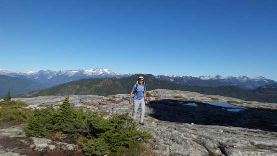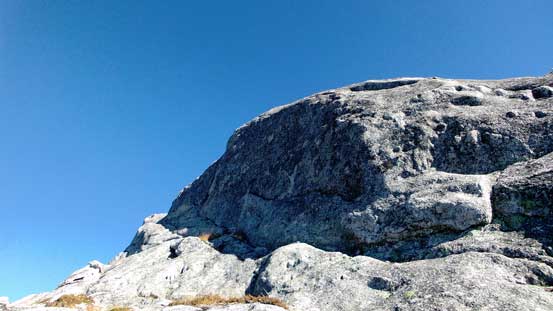 This concluded the lower half of this climb, and looking ahead we could see the terrain started to get easier. There’d be multiple ways to overcome the next section but the general direction was to ascend way over to the climber’s right along a rising traverse ledge. I went up initially to the left and then cut back over to the right. There’s a batman rope aiding a line straight up rather than going to the left, but we didn’t see it during the ascent. And once the ledge traverse was done we entered some Class 3-4 terrain that terminated at another batman rope. We used it (my first time batman up a rope) and then the hard stuff was finally over. In short time it’s the summit celebration.