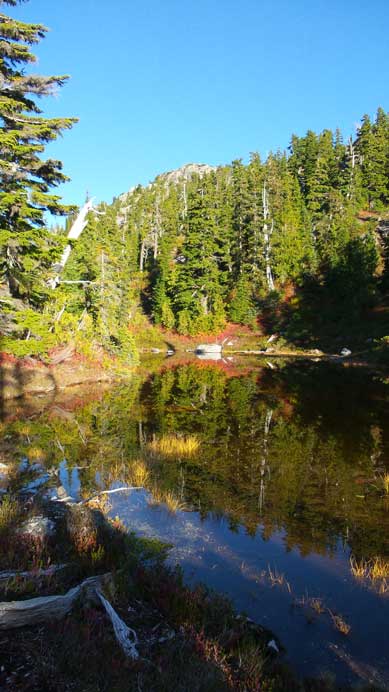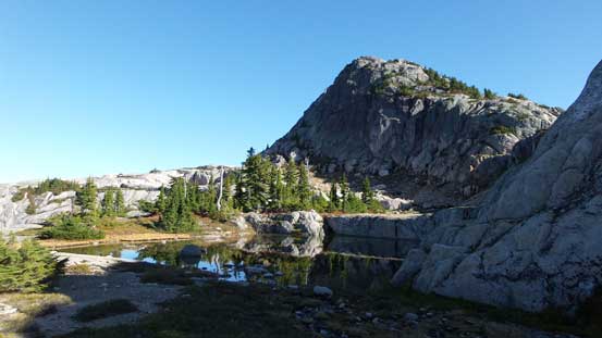 For the first bump we went up and over it and while descending the other side we started encountering difficulties here and there. There’s a bit of flaggings but not much of a path so from now on we pretty much had to find our own route. There’s some scrambling up to Class 3 occasionally mixed with bushwhacking and I had to say it wasn’t fun… For the second bump we went around to the right (north) and successfully bypassed it, and with that in mind we tried to do the same for the third one (a smaller bump). Here we almost cliffed out but managed to get back on track (not without difficulty though). There’s more flagging and more of a path coming up, but for the next few bumps we basically went straight up and over, on again, scrambly and bushwhacky terrain… Finally we made to the last major one, fully expecting a trail on the other side. But guess what? Nope… There’s no trail and we got lost again. Oh well… Back to the bushwhacking game we did manage to find a trail somewhere lower down, followed it for a while then lost it again at a tarn. We searched around and found another trail somewhere, and eventually joined the main Al’s Habrich trail. Now we were expecting a trouble-free stroll back to the Jeep, but guess what?! Nope again… This was one of the worst officially marked trail I’d ever hiked and we got lost at least 4 or 5 times. It also travelled extensively on slabs (thus, very hard to follow). But eventually we did clear it out and 20 more minutes later on the logging road we arrived back to the Jeep… It’s not over yet as I still had to carefully drive down the rough road…
