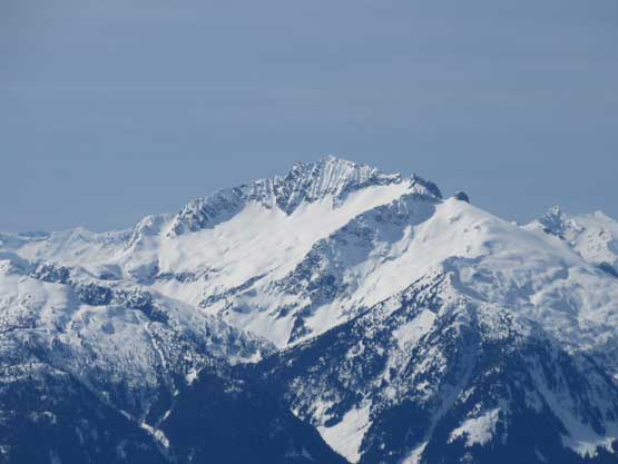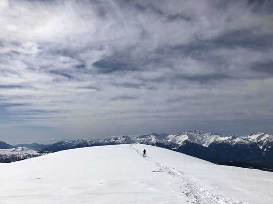 Resuming the ascent the slope angle increased again towards the distant Price/Clinker col. The steepest stretch was right below the col that I estimated the slope was at least 35 degrees. The Lightning Ascents could barely made a straight-up style of ascent even with the previous tracks. Above that section we took a line angling climber’s left following a set of ski descent tracks. This direct route certainly cut some distance but involved more steep slopes. Mel was strong and broke trail for the entire way and I couldn’t even keep up. The summit of Mt. Price was as large as a soccer field so we had to wonder around in order to soak in all of the views. There went the 800th summit of mine.
