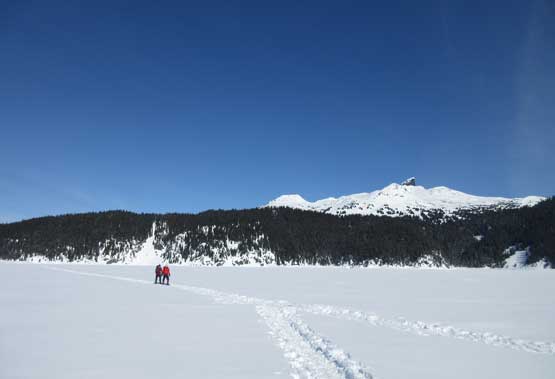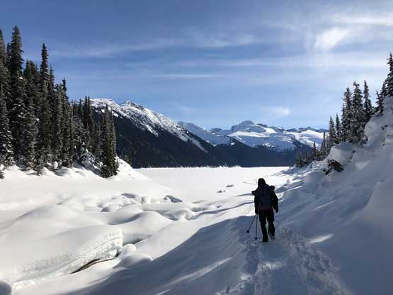 There’s a huge Chinese group from crossna.com that did Mt. Price via winter route on Saturday and they gave us a ton of fresh beta. Based on what they reported Mel and I decided to hike the entire approach to Garibaldi Lake on trail-runners while carrying boots and snowshoes, and instead of hauling the 30′ Lightning Ascents I opted for the 25′ pair. I normally do not trust the 25′ snowshoes in the dead winter but given that at least 8 snowshoeers had made an ascent a mere day ago I wouldn’t expect any form of trail-breaking. There’s literally nothing worth documenting about the death march approach – 2.5 km to the parking lot and then 9 km to the lake with about 1000 m elevation gain and minimal view… Our group was fast and I had to push myself in order to keep up the pace. We made to the “6 km Junction” in 2 hours and after a short break to regroup we spent another hour to reach the lake, crispy and very cold…