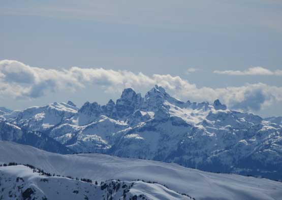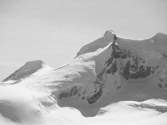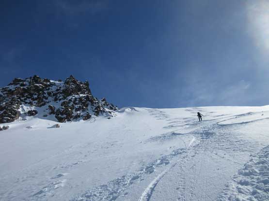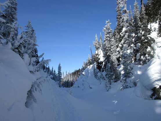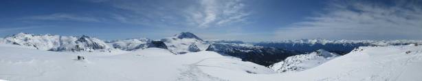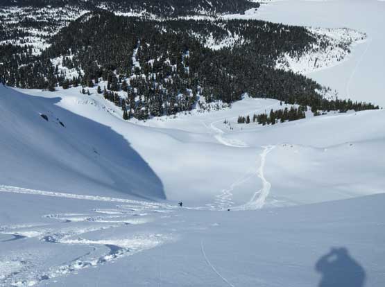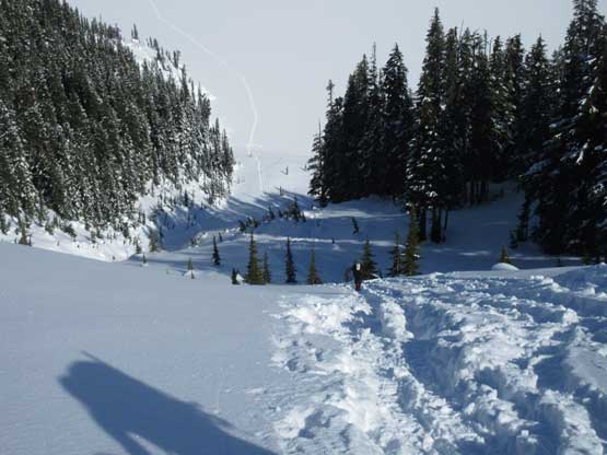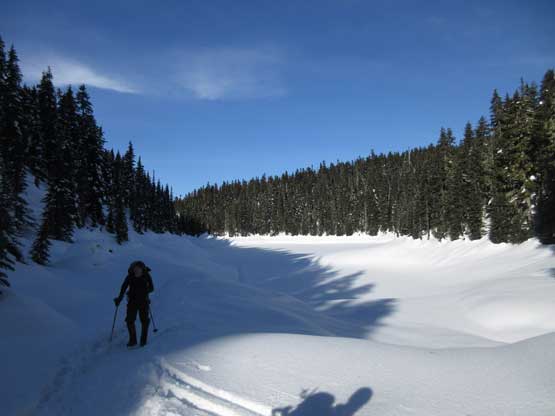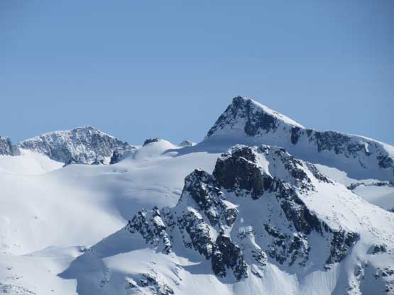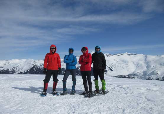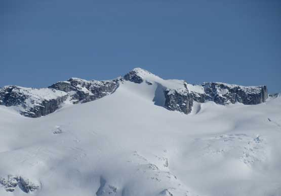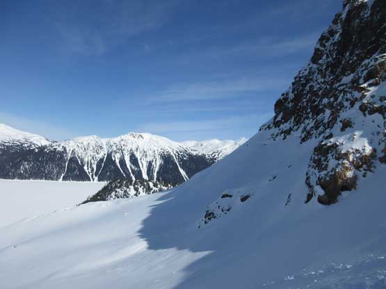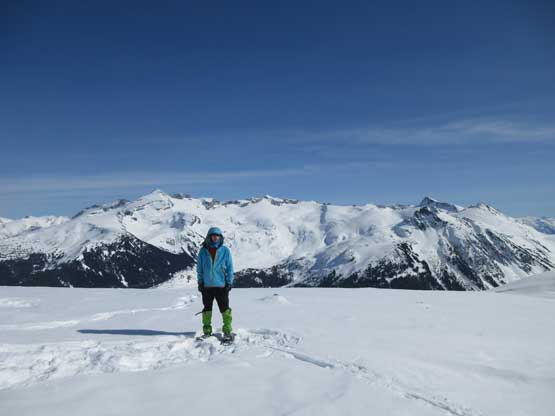 Once onto the frozen lake we took the first lengthy break to don some gears. Mel and I took the runners off in trade for mountaineering boots, and then ditched the runners (and microspikes) right beside the trail thinking that nobody would bother steeling the smelly boots… We all strapped the snowshoes on and continued into the next stage of plodding – about 3 km of monotonous plod on the frozen Garibaldi Lake. The slog was boring as fuck, but let’s face it. We managed to pick up the massive set of snowshoe tracks and the next stage was a steep grunt up the west of the two “north flanks gullies”. After a while the slope mellowed out and we entered a “bowl” feature.