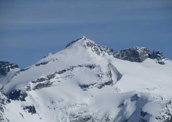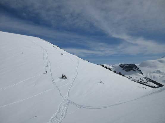 We stayed for almost an hour on the summit before making the descent. The small summit of Clinker Peak looked to be more involved than anticipated with some cliffs guarding the block, but at this point we had no excuse but finding a way there. The avalanche condition was Low/Low/Low so I was willing to tackle some steep shits, if needed. Tiger and Milan decided to slowly hike back while Mel and I pressed on with an ascent of Clinker Peak.