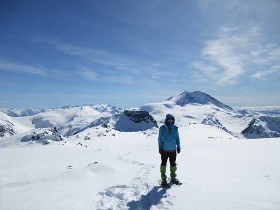 Once onto the frozen lake we took the first lengthy break to don some gears. Mel and I took the runners off in trade for mountaineering boots, and then ditched the runners (and microspikes) right beside the trail thinking that nobody would bother steeling the smelly boots… We all strapped the snowshoes on and continued into the next stage of plodding – about 3 km of monotonous plod on the frozen Garibaldi Lake. The slog was boring as fuck, but let’s face it. We managed to pick up the massive set of snowshoe tracks and the next stage was a steep grunt up the west of the two “north flanks gullies”. After a while the slope mellowed out and we entered a “bowl” feature.