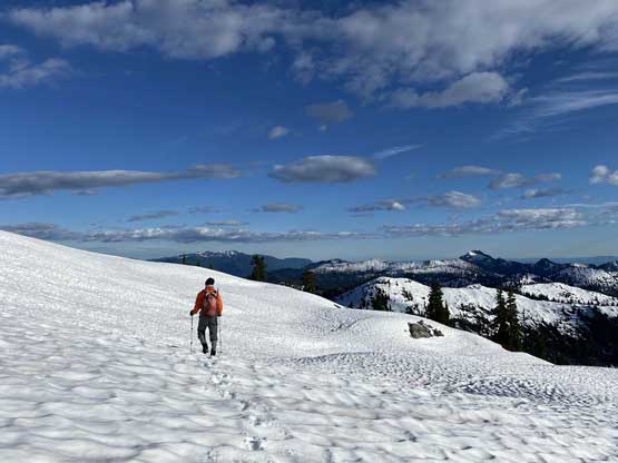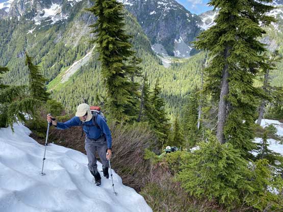 The lowest point of this trip was Conybeare/Sedgwick col and from the col onward we had to deal with a bit of bushwhacking but the ascent soon became a smooth-going on snow. I thought about following the ridge but one bushy step and buttress forced us to traverse onto the snow slopes to our right. We then easily ascended onto the east ridge at 1550 m where we took a lengthy break. There were several options. My original plan was to ascend the SE Face straight up to the summit but changed my mind upon seeing an obvious line diagonally up traversing the face onto the upper south ridge. This would be longer in distance, but allowed us to ditch our packs once intersecting the south ridge. The ascent/traverse turned out to be a foreshortened slog that took us at least an hour if not longer. To reduce slipping and to make side-hilling easier we opted to wear crampons.