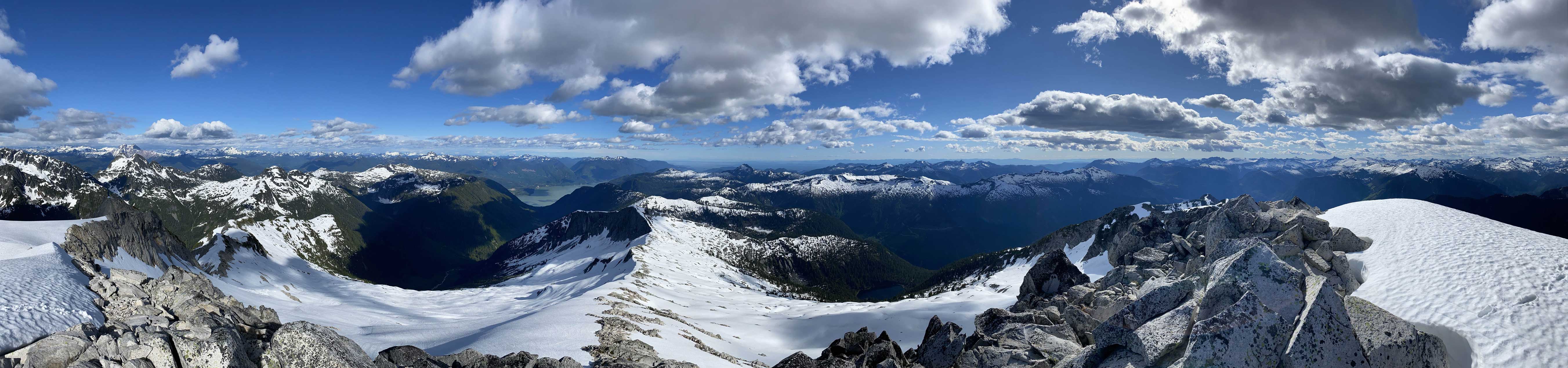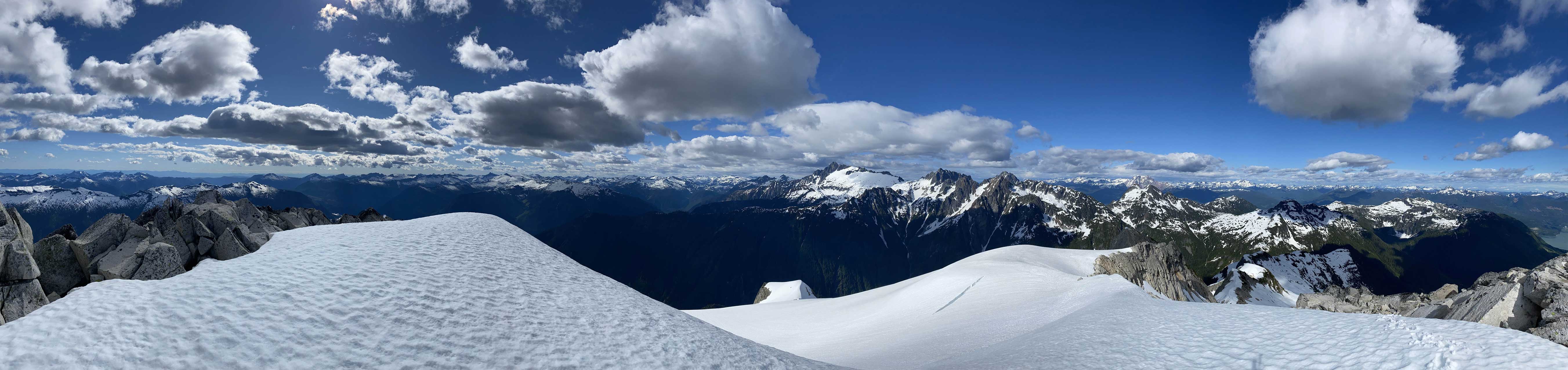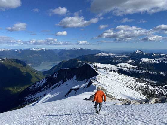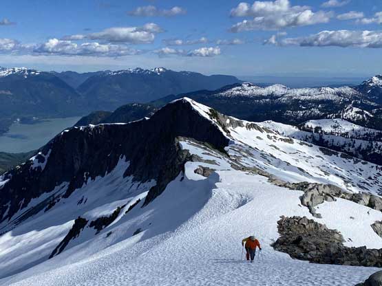 We took another long break on the upper south ridge ditching everything including our packs. The ascent to the summit still required more than 200 m elevation gain so in retrospect I should have eaten something. We then carried on, plodding up the never-ending snow ridge with fabulous views towards all directions. The summit pyramid had some fun class 2-3 scrambling. At this point I was exhausted for not eating enough but still managed to drag tired self onto the summit. The last register enjoy was indeed Maria Masiar’s in summer 2019 in which they took a boat and started from Woodfibre Mill at sea level.