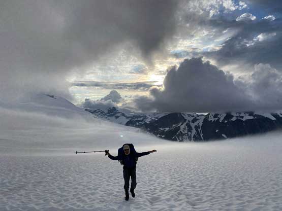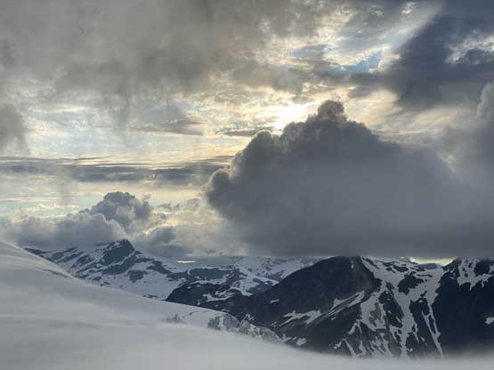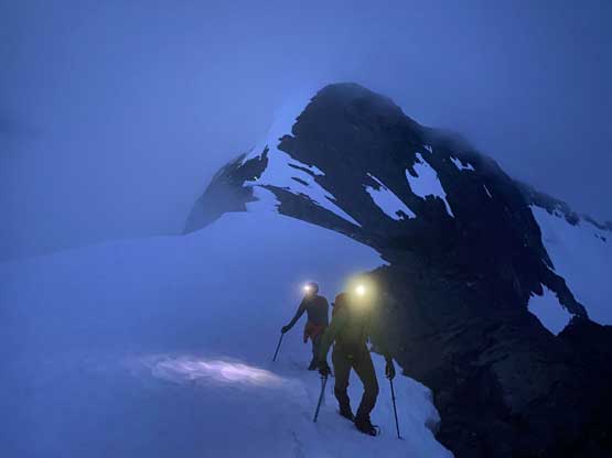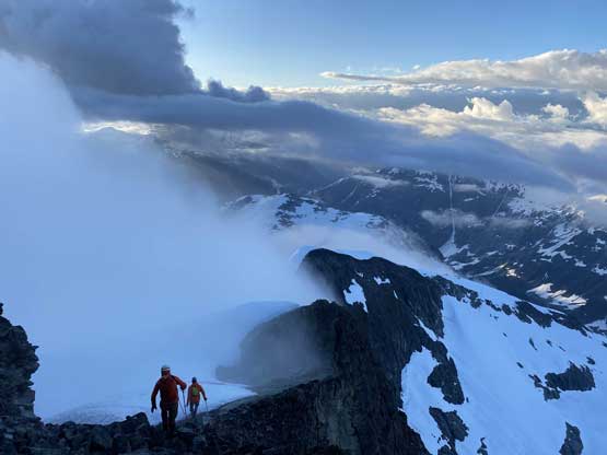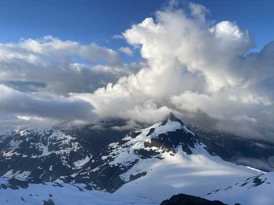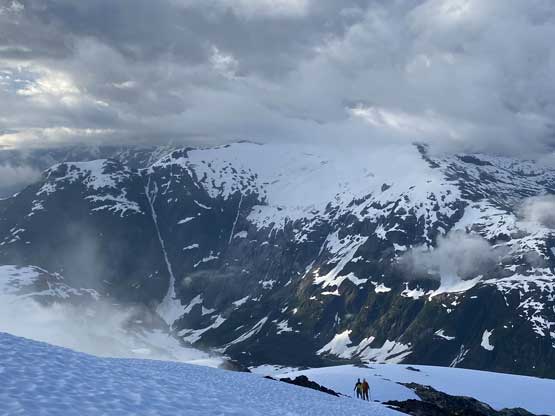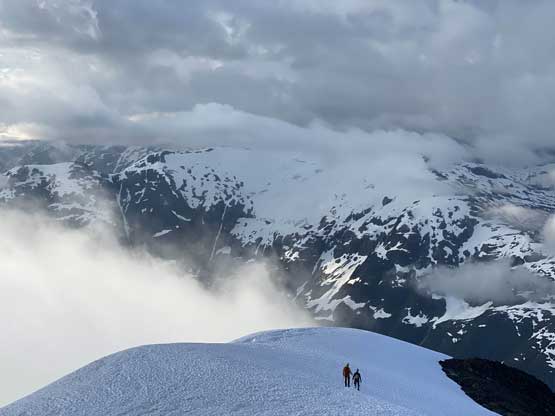 It’s essentially Alex who made the entire plan of the horseshoe traverse from Mt. Willson towards Ashlu Mountain across the headwaters of Sims Creek. I did make some slight revision of the plan but for the large part I agreed with Alex’s itinerary. The three of us pulled the trigger at the last minute, scrambled to pack up our 10 days’ food and confirmed with the pilot. We were dropped off near the summit of Mt. Willson, traversed into the heart of Clendinning area while bagging a bunch of peaks. We did one major detour down to 1000 m zone with significant bushwhacking and then made an ascent of Mt. Boardman. We then traversed the entire stretch of Ross Ridge then to Inaccessible Pass. Then on the 4th day, we climbed Mt. George Edwards that turned out to be my 1000th summit, and descended the upper Tinniswood Glacier in some full-on white-outs. The weather lifted briefly as we approached the base of Mt. Tinniswood that suddenly boosted our stoke level. We plodded all the way to the very bottom of the peak to set up a late camp, cooked dinner in dark and turned in at midnight. To take advantage of the morning weather window we set the alarm at 3 am. I did get a couple hours’ sleep but Alex and Vlad almost got none.