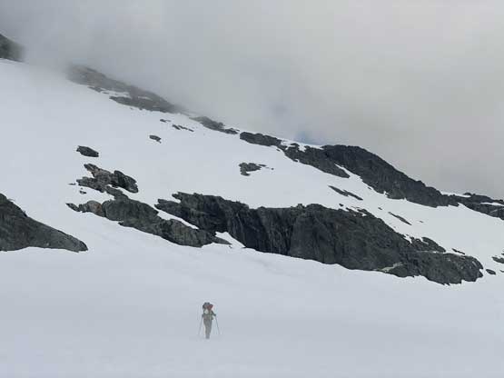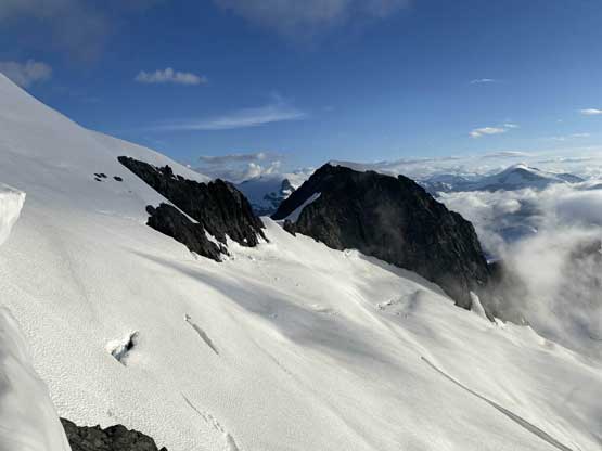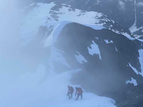 The alarm went off and we forced in some cold breakfast and up we went, in the thick and humid mist. The peak was completely soaked in but I was hoping for some partial views as we got higher. From camp we ascended a section of 35 degree snow and trended climber’s right to intersect the long east ridge of Mt. Tinniswood. There are multiple possible entry points on the ridge and it really doesn’t matter. We went a bit too high that resulted in some unnecessary scrambling but on hindsight it didn’t cost us extra energy nor time. Once onto the east ridge we enjoyed a while of cruise-sailing on easy snow. The east ridge is divided into two big steps with the lower step much simpler than the upper step. The connection between the two steps is a stretch of flat but corniced ridge that required some caution. The upper ridge was where the fun and steep snow climbing started. The term “steep” here is relative, as the steepest stretch was no worse than 45 degrees and were all short-lived without much of exposure.