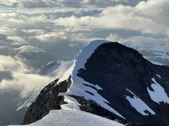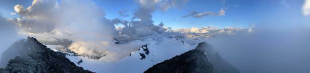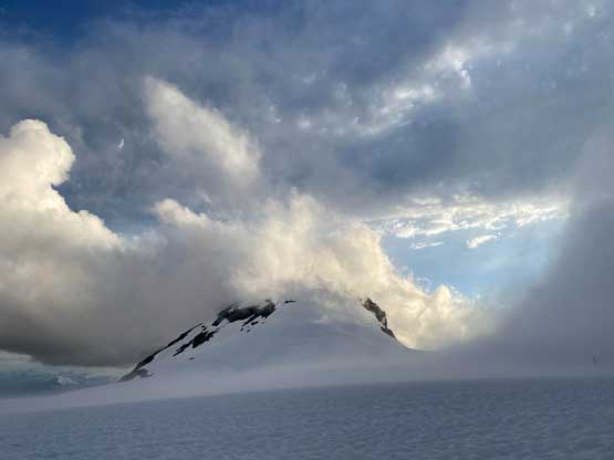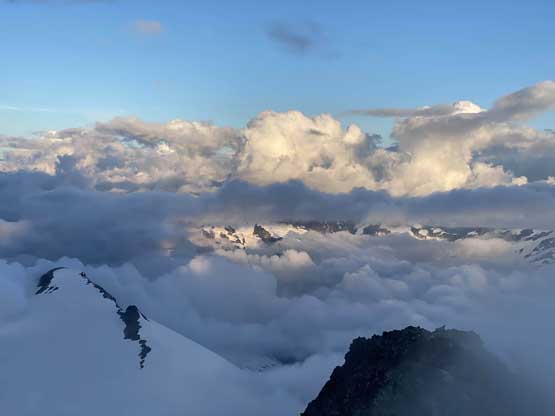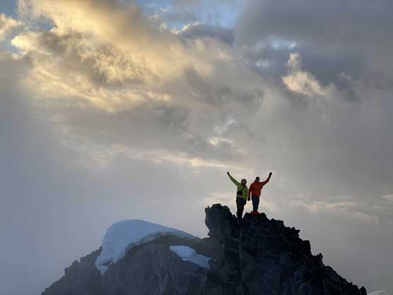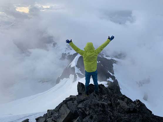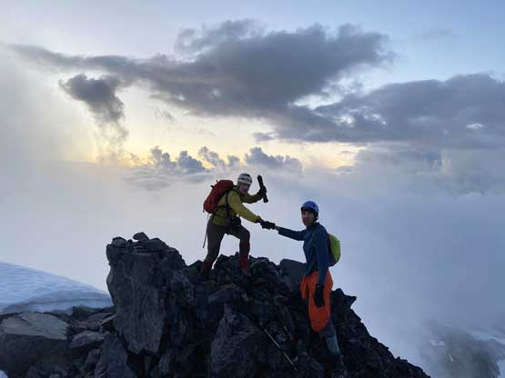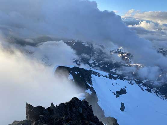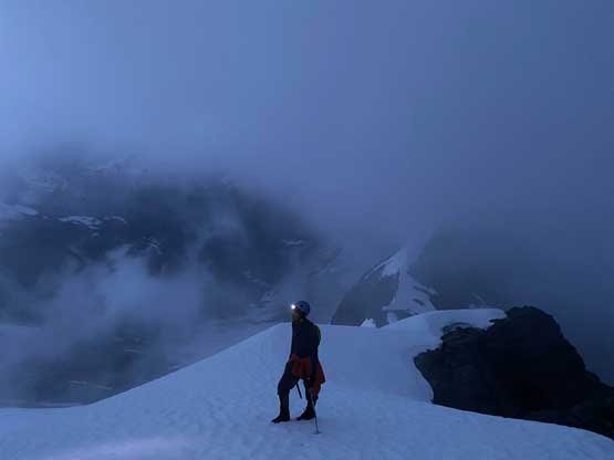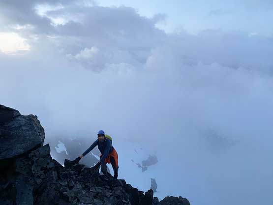 Towards the summit pyramid we finally could turn off the headlamps and the clouds finally started to break a bit revealing partial views. The summit pyramid looked insane but was actually easy with only some class 2 scrambling on loose blocks on the climber’s left side. Due to the moving clouds and in-and-out views we opted to stay almost an hour on the summit and did manage to get some views. The register was full on history and was fun to read.