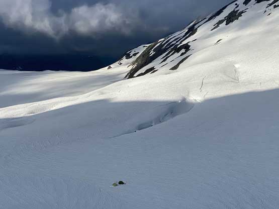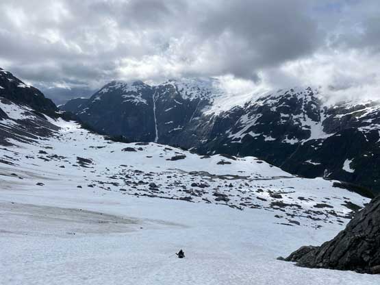 Vlad took a glissade on some icy snow that I barely able to boot-ski