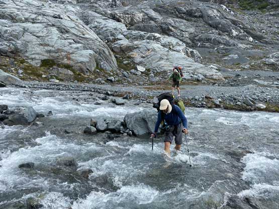 Eventually it’s the time to descend. The best photos I got was from descending the upper East Ridge as the sun poked through. A few short stretches required us to down-climb facing into the slopes but for the most parts it was just a walk-off following our tracks. I think we got back to camp in only an hour after leaving the summit. Due to the incoming weather we decided to push on, so we packed camp. The next thing we were descending the not-so-pleasant section to bypass Mt. Casement while losing an additional 700 m elevation. This stretch would be enjoyable on snow, but we had to deal with rubble and talus along with some icy snow that’s too difficult to plunge on. There was also some minor route-finding issues but at least at this point we were back onto the “known” terrain. Previous parties had all gone through this stretch and we knew it would go. There’s one more obstacle near the base of Mt. Casement that we had to take the boots off to cross a freezing stream, which actually felt fairly refreshing.