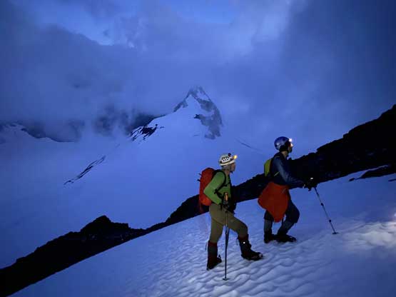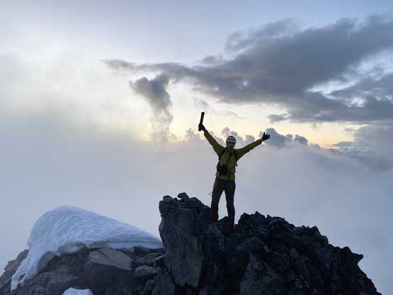 Towards the summit pyramid we finally could turn off the headlamps and the clouds finally started to break a bit revealing partial views. The summit pyramid looked insane but was actually easy with only some class 2 scrambling on loose blocks on the climber’s left side. Due to the moving clouds and in-and-out views we opted to stay almost an hour on the summit and did manage to get some views. The register was full on history and was fun to read.