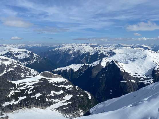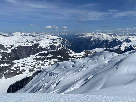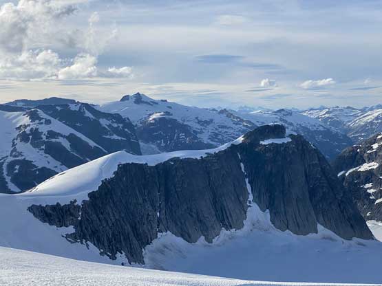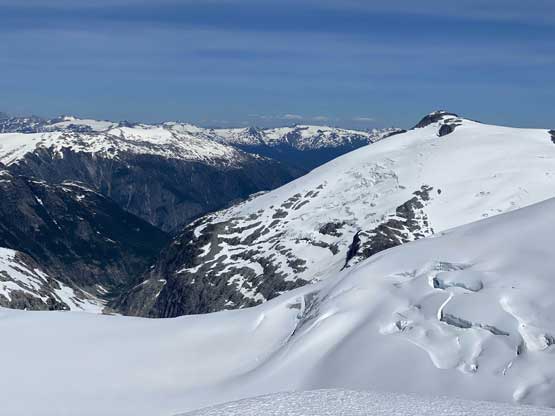 Mt. Whiting along its sub-summits and Sergent and Corporal Mountains form the undulating Ross Ridge that guards Ross Arm of Clendinning Glacier on the east and north-east side. Mt. Whiting is the tallest of these peaks and also offers the best views. A traverse of Mt. Whiting and the sub-summits offers some of the finest views in the southern Coast Mountains. This was the 3rd day of our grand adventure traversing the Clendinning Range. Earlier in the day Alex, Vlad and I had ascended Mt. Boardman, Sergeant Mountain and Corporal Mountain. Our objective of the evening was to carry over Mt. Whiting and the sub-summits and camp near Pivotal Mountain.