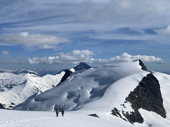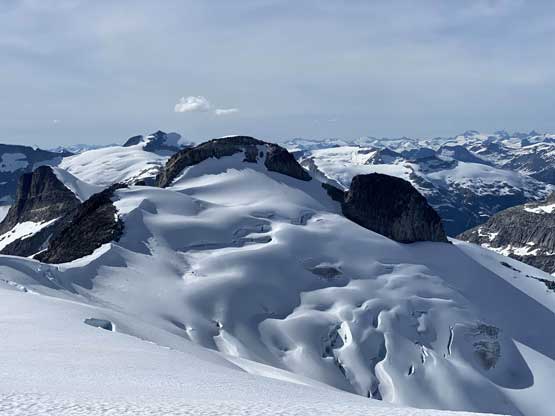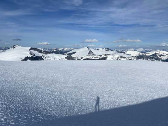 The first section was to plod over the north summit which was done mostly on snow but a few narrow sections needed to be done on rock slabs. I thought we could have bypassed it but upon closer examination we decided to just plod up and over it. The descent down to the north/central summit col was easy going on snow and glacier.