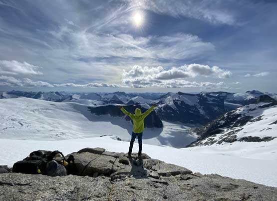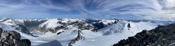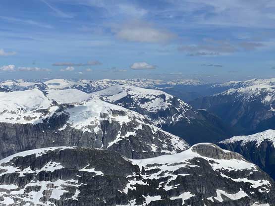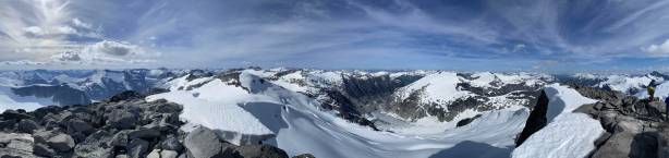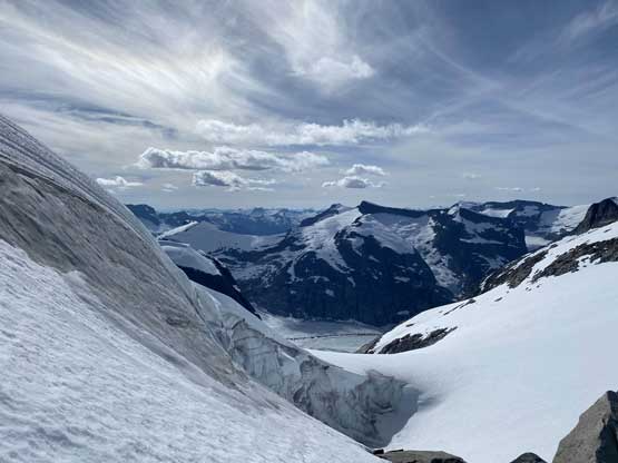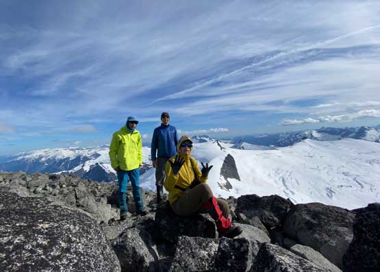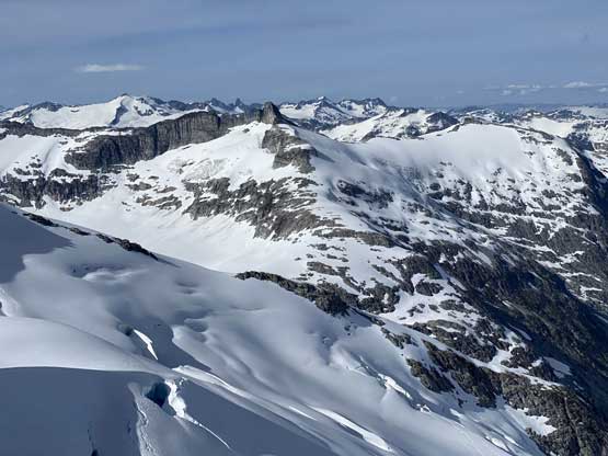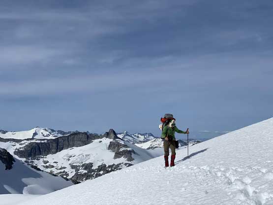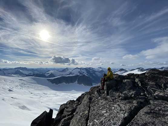 From the col we then easily ascended gentle snow slopes to the base of the summit pyramid where we took a long break ditching the backpacks. To reach the highest point involved some class 2 scrambling on loose rocks and then I went at least 100 m further east for more open views into Sims Creek valley. This summit had some of my favourate views of this entire trip so that’s why I went a fair bit further than necessary.