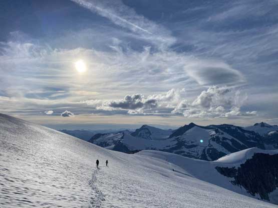 The south summit could be bypassed on snow slopes on the west side but we were kind of tired of side-hilling at this point so opted to ascend up and over the south summit, which turned out to be a great call. The south summit had some nice views towards Mt. Tinniswood area. Once taking enough photos the next objective was to reach the bump right next to Pivotal Mountain, at the end of Ross Ridge. We didn’t bother to ascend any unnecessary bump at this point as we were tired. The side-hilling was pretty easy on the soft snow but we did have to be extra cautious about crevasses, working around some obvious sagging. We found a nice spot to set up camp and I even managed to camp on rock for the first time in this trip. Alex and Vlad weren’t as lucky as their tent was much bigger than mine. At this point we had a little over an hour’s day time left and after some debates we opted to hike up Pivotal Mountain for sunset.