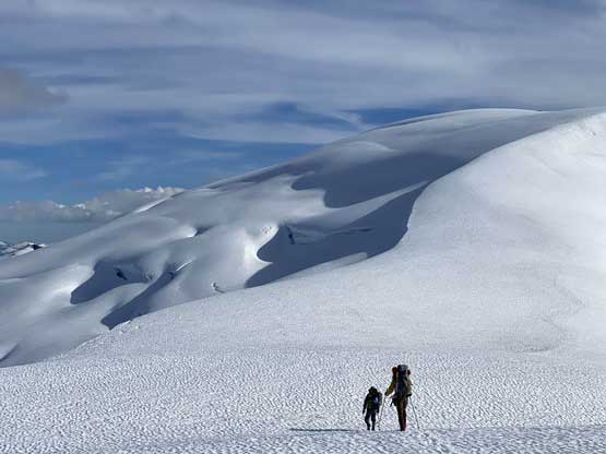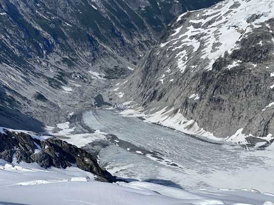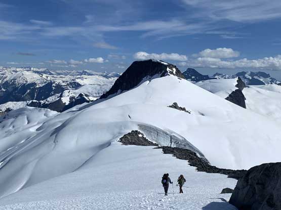 The first section was to plod over the north summit which was done mostly on snow but a few narrow sections needed to be done on rock slabs. I thought we could have bypassed it but upon closer examination we decided to just plod up and over it. The descent down to the north/central summit col was easy going on snow and glacier.