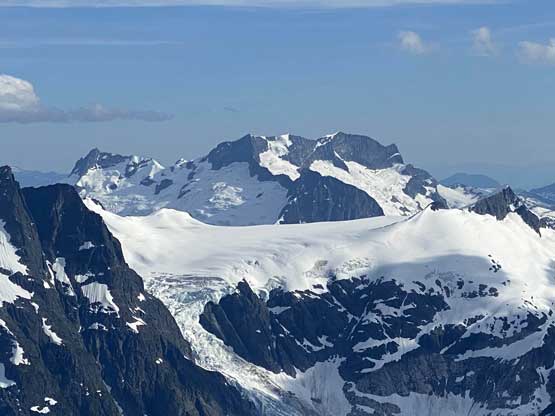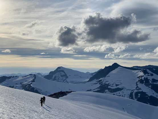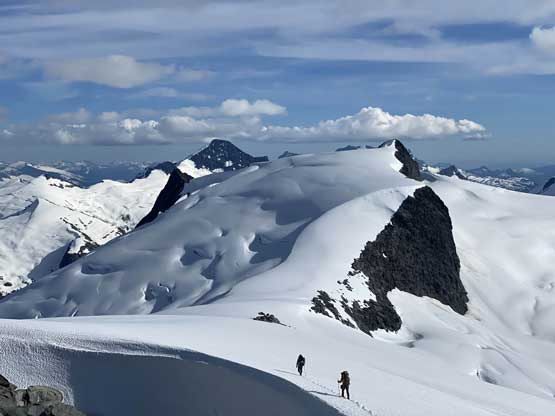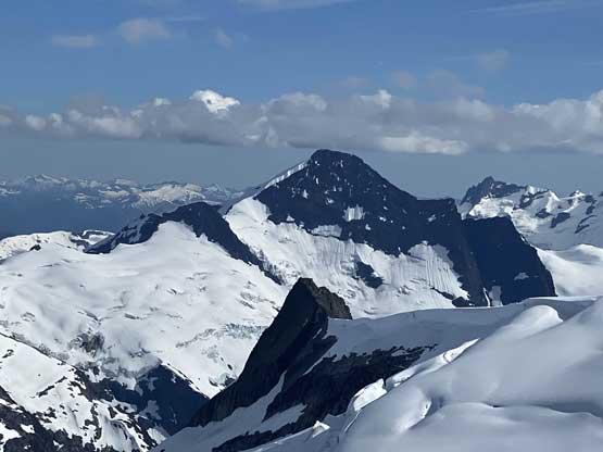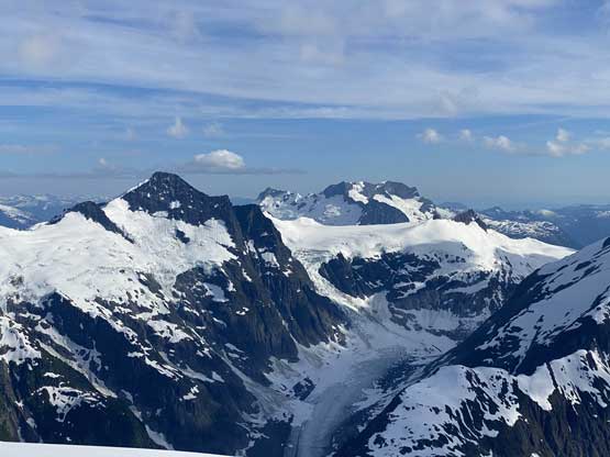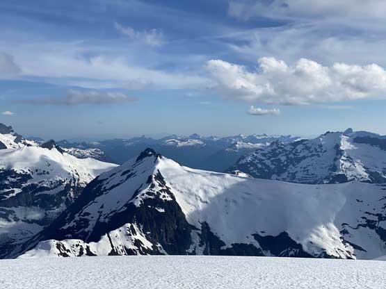 Mt. Whiting along its sub-summits and Sergent and Corporal Mountains form the undulating Ross Ridge that guards Ross Arm of Clendinning Glacier on the east and north-east side. Mt. Whiting is the tallest of these peaks and also offers the best views. A traverse of Mt. Whiting and the sub-summits offers some of the finest views in the southern Coast Mountains. This was the 3rd day of our grand adventure traversing the Clendinning Range. Earlier in the day Alex, Vlad and I had ascended Mt. Boardman, Sergeant Mountain and Corporal Mountain. Our objective of the evening was to carry over Mt. Whiting and the sub-summits and camp near Pivotal Mountain.