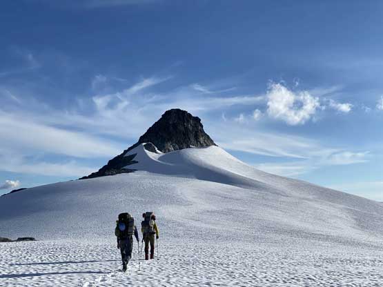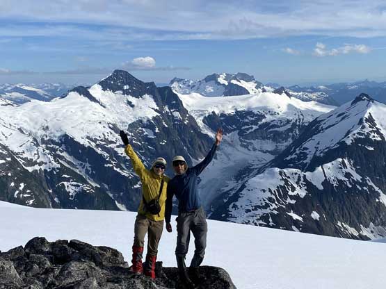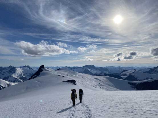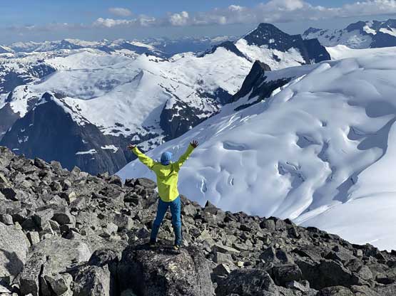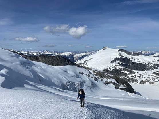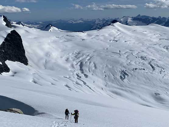 From the col we then easily ascended gentle snow slopes to the base of the summit pyramid where we took a long break ditching the backpacks. To reach the highest point involved some class 2 scrambling on loose rocks and then I went at least 100 m further east for more open views into Sims Creek valley. This summit had some of my favourate views of this entire trip so that’s why I went a fair bit further than necessary.