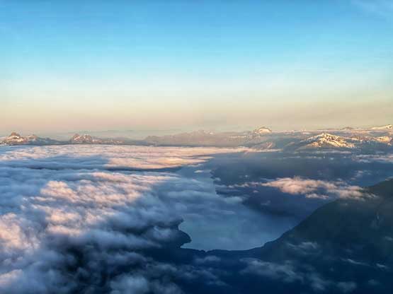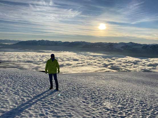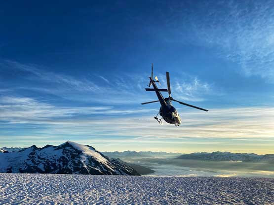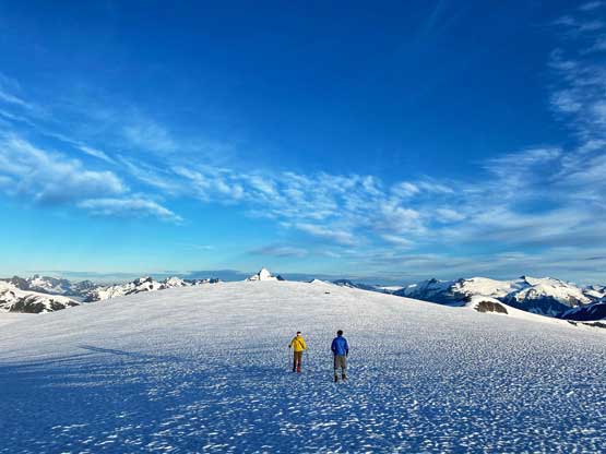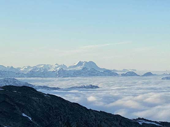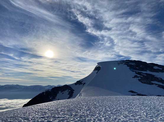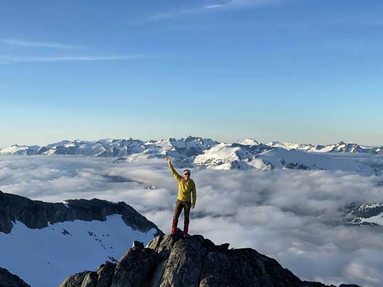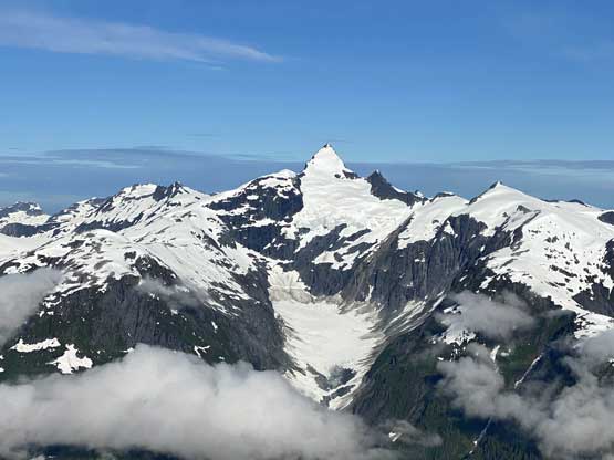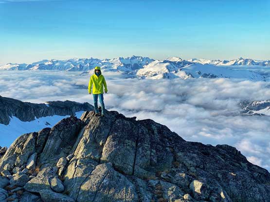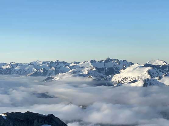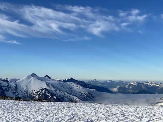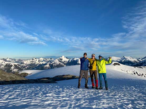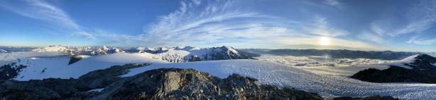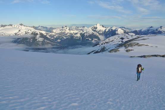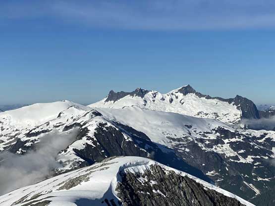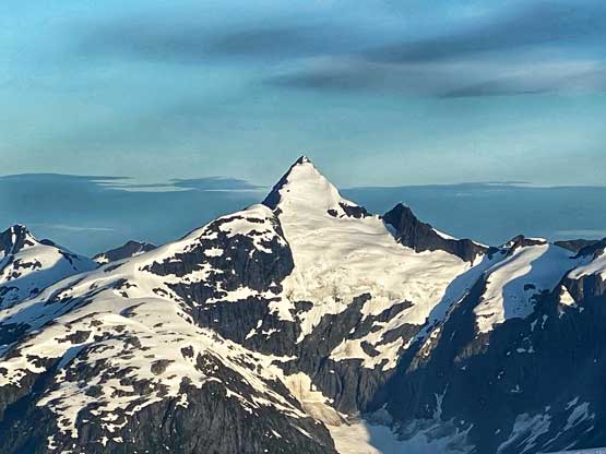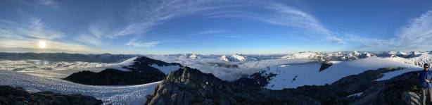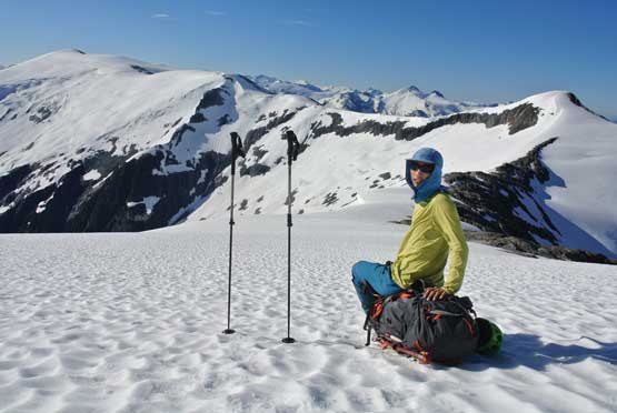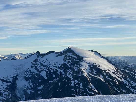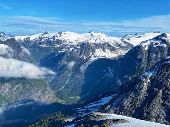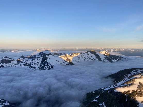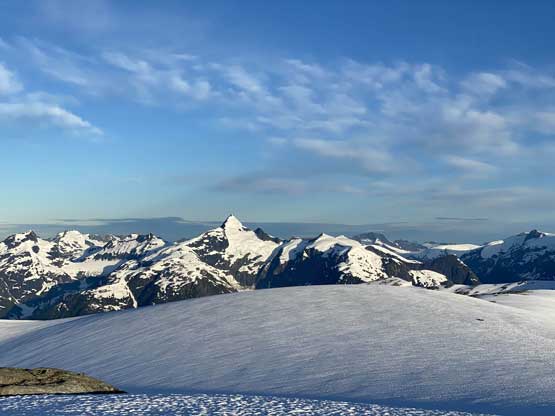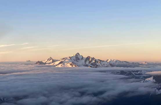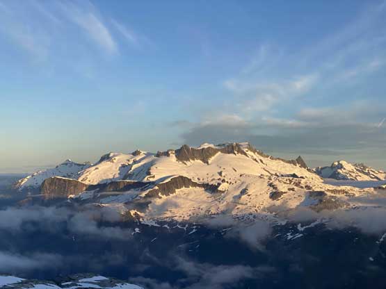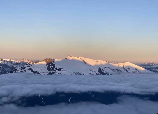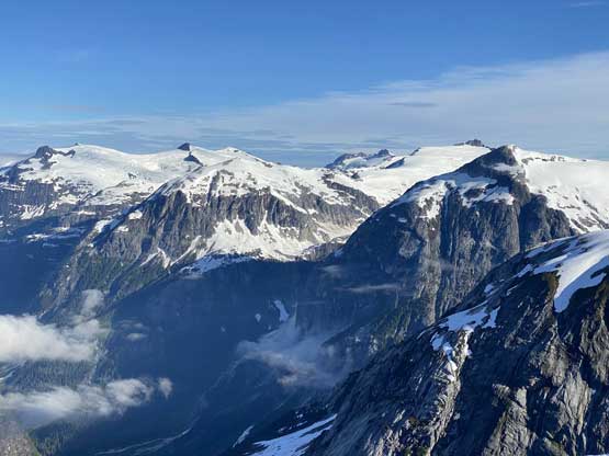 The first summit would be a mechanical ascent with taking a helicopter to within 15 minutes of walking to the summit. My pack weighted 24 kg at the start and the plan of our first day was to plod past Mt. Oswald to Oswald/Vanstone col (26 km and 1500 m gain) so we arranged our flight for as early as possible. The three of us grouped at Alex’s home at 3:30 am and in under 2 hours we were at the Squamish airport taking to our pilot. We flew up beside Tantalus Range, over the entire course of Ashlu-Elaho divide towards Princess Louisa Inlet at sunrise time. We briefly landed at Mt. John Clarke and scouted out a 5-star food drop spot and then took off again to the north side of Sims Creek. We landed as close to the summit as possible leaving only 15 minutes of leisure walk to our first peak of the expedition.