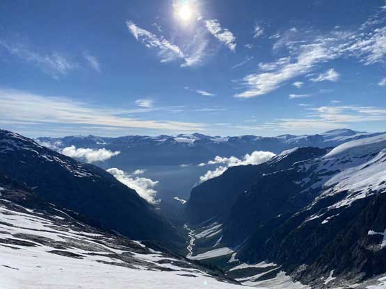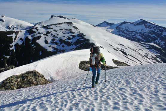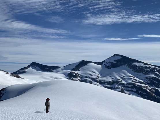 After taking some obligatory photos we soon descended and shouldered our ridiculously heavy packs. The snow was a bit icy in the morning adding to the challenge too but thankfully the terrain wasn’t steep enough to warrant the use of crampons. The plod wasn’t as easy as I was hoping for, up and over the subsidiary summit 4 km west of Mt. Willson with considerable amount of up-and-downs but at least the views were really nice up there with unobstructed sight into the deep Sims Creek valley.