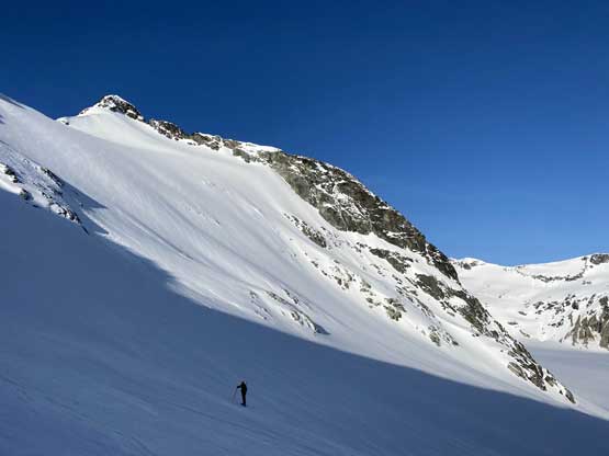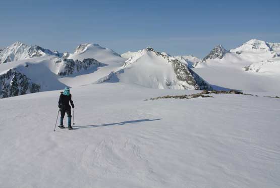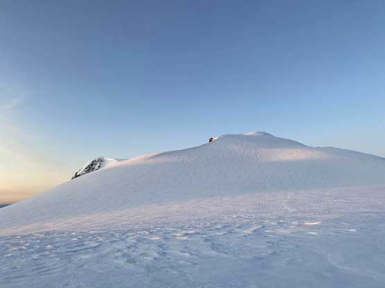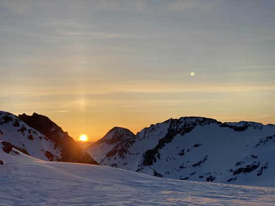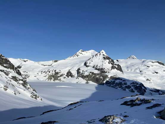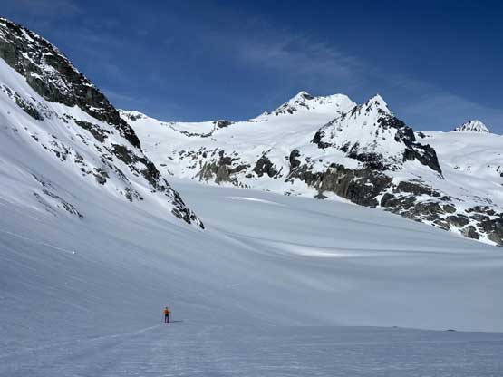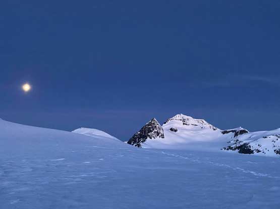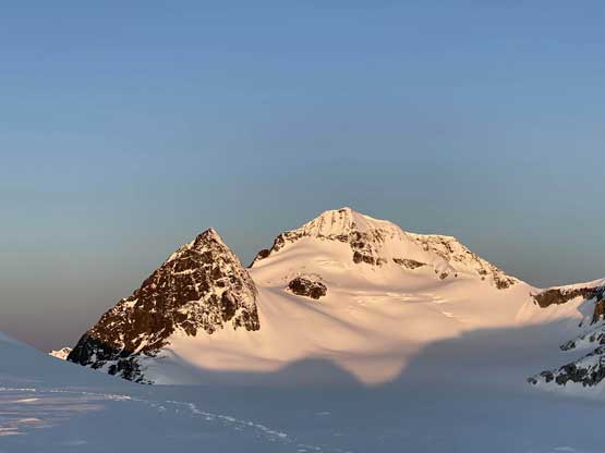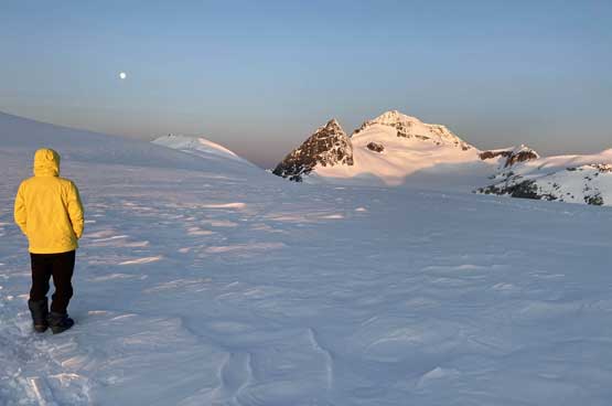 Given the warm temperature in the forecast we opted to wake up and cook breakfast at dawn, and while waiting for sunrise we would break camp. By the time the sunrise show was over we were just about to go. The descent down Weart Glacier was very easy on firm snow and in short time we were down to the flats below “Eureka Couloir”. We found a nice rock platform to drop the heavy packs and swapped for the day-packs. From there it was again, and easy snowshoe stroll to Eureka/Oasis col albeit a little steep towards the end.