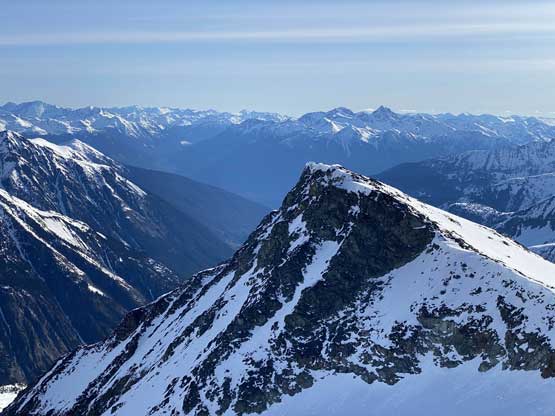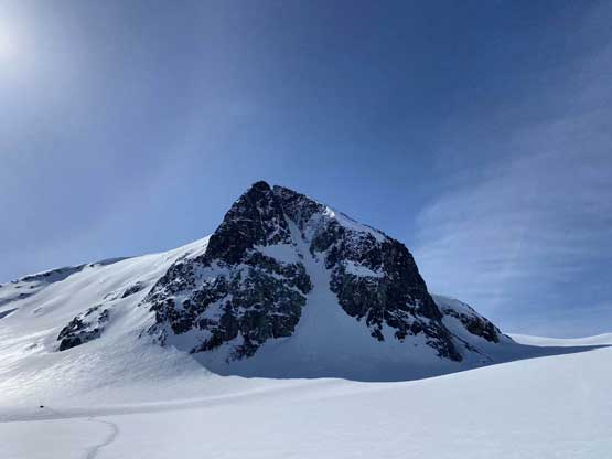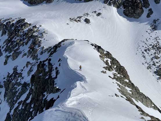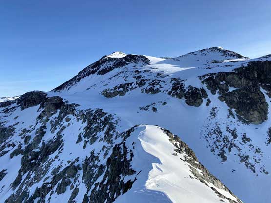 There was one narrow stretch to traverse over on the connecting ridge as well as one steep roll that was 35-40 degrees but short-lived. We kept snowshoes on for the whole time. After that steep roll the rest of the ascent via south ridge was a no-brainer. It was super scenic though that we stopped to take a lot of photos.