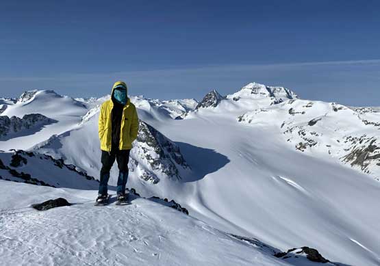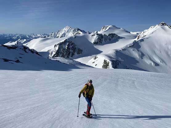 Alex snowshoeing up with Eureka Mountain’s north glacier as a backdrop