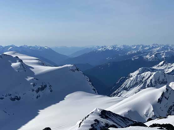 Again the summit was cold and windy despite the forecast so after a while we reluctantly started the descent. For the south ridge descent I opted to boot-pack as the snow was still firm enough. That steep roll required us to strap snowshoes back on and down-climb facing into the slope. The rest of the descent back to our heavy packs was uneventful and then it’s time to plod across Weart Glacier to aim for Mt. Moe.
