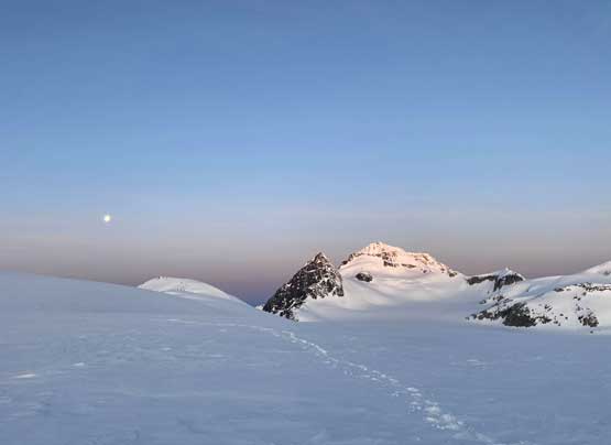 Given the warm temperature in the forecast we opted to wake up and cook breakfast at dawn, and while waiting for sunrise we would break camp. By the time the sunrise show was over we were just about to go. The descent down Weart Glacier was very easy on firm snow and in short time we were down to the flats below “Eureka Couloir”. We found a nice rock platform to drop the heavy packs and swapped for the day-packs. From there it was again, and easy snowshoe stroll to Eureka/Oasis col albeit a little steep towards the end.