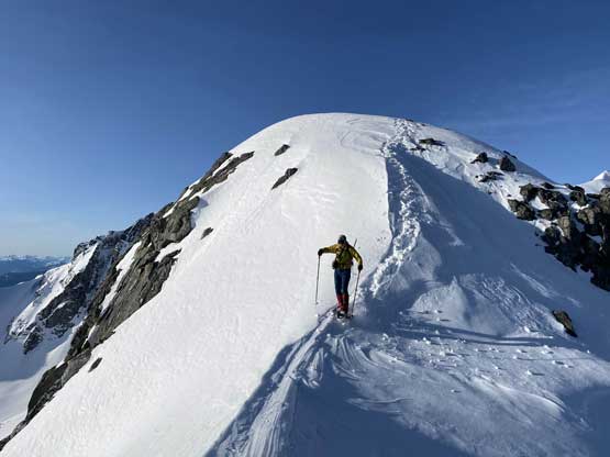 There was one narrow stretch to traverse over on the connecting ridge as well as one steep roll that was 35-40 degrees but short-lived. We kept snowshoes on for the whole time. After that steep roll the rest of the ascent via south ridge was a no-brainer. It was super scenic though that we stopped to take a lot of photos.