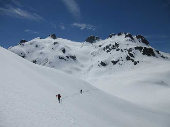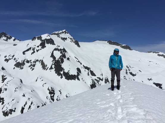After completing an ascent of Crawford Peak via its north glacier we came down into the valley between Crawford and Paranoid Peaks. The most direct assault on Paranoid Peak would be the S/SE Ridge but none of us came prepared with an ice axe. The last pitch looked too steep to attempt without an ice axe and the snowpack was getting very slushy in the afternoon sun. An alternative route would be the NW Ridge. It looked gentler but involved more elevation loss/regain. The steep grunt to get onto the NW Ridge proper turned out to be as ugly and uninspiring as it looked.