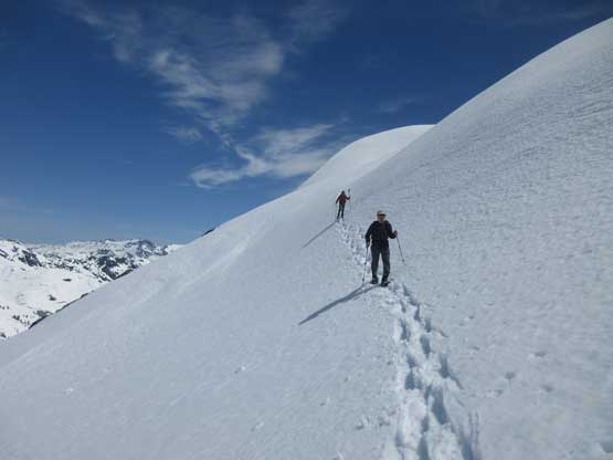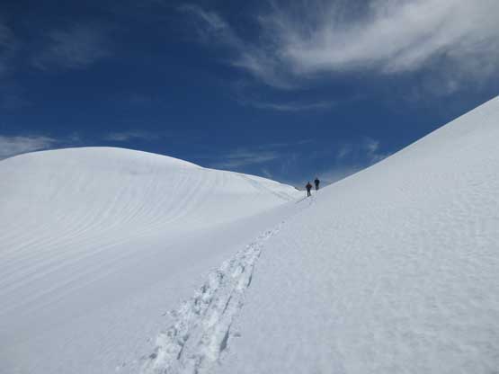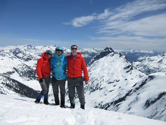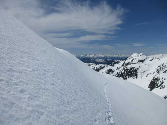 Once onto the NW Ridge there’s a drastic change in scenery and motivation. The views opened up suddenly down into the rarely-visited Bucklin Creek valley. The ridge appeared to be aesthetic with a couple steep rises and bumps. I thought we would have to take the snowshoes off at some point but that wasn’t the case. I managed to lead a line zig-zagging up some steep stretches with the snowshoes worn all the way to the summit.