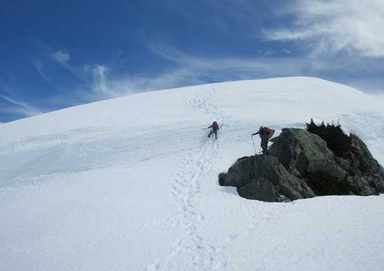 Snowshoeing up steep slopes to gain the NW Ridge.