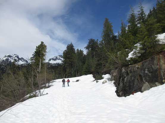 After another long stay on the summit we figured it’s finally the time to head home. Plunging down the NW Ridge and then into the headwater of Paranoid Creek was a fast and fun process. Plodding back across the upper valley was also fast and fun, but then we had to deal with that annoying side-hilling stretch. The softened afternoon snowpack had created some questionable snow bridges that we had to pay extra close attention. The slog back towards “Skullhead Pass” wasn’t too bad as on the return we picked a more efficient line avoiding that steep forest section. Not doing much of a lingering we continued the descent down the maze of logging roads and eventually joined Watersprite Lake’s summer trail. We opted to take that bushwhack short-cut as why not. Despite the dense bush it easily saved us 2 km of distance. The final 3 km plod on Skookum Dam Road was boring but fast.