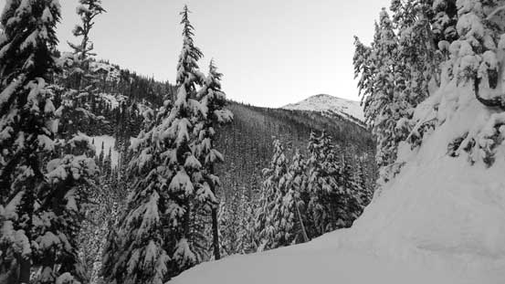 After what seemed like quite a long time the “Glacier Road” took a gradual turn due south-east into Blackcomb Creek valley. The sky’s getting bright enough at this point and half an hour later we watched some neat alpenglow looking back at Rainbow Mountain. Now deep into the valley we left the road at the base of “Poop Chutes” following some ski tracks, and minutes later we deviated from the tracks and entered the forest. The next stage was the most experimental as it’d involve some steep forest with very little beta on the internet. Upon close inspection it didn’t look too bad and all we needed was to keep a diagonal traverse line due climber’s left. It’s a bit difficult to keep that diagonal mode given how steep that forest was, but we did fine. Vlad and I took turn breaking trail and one hour or so later we broke out of the forest on the broad NW flanks of Phalanx Mountain.