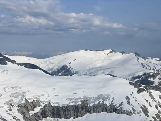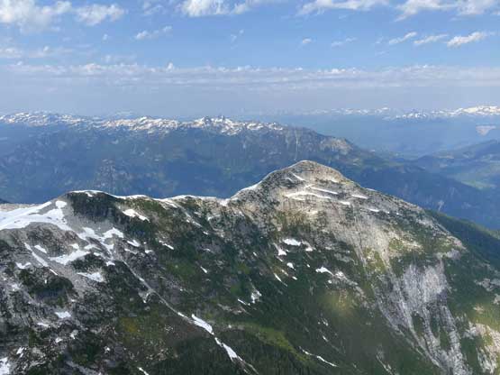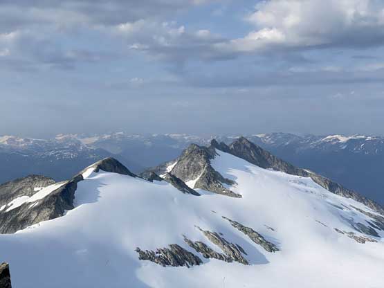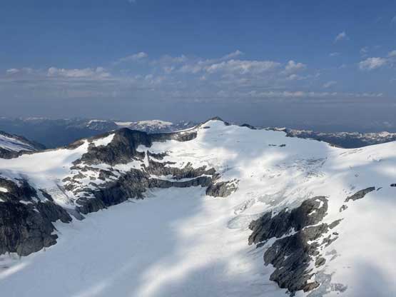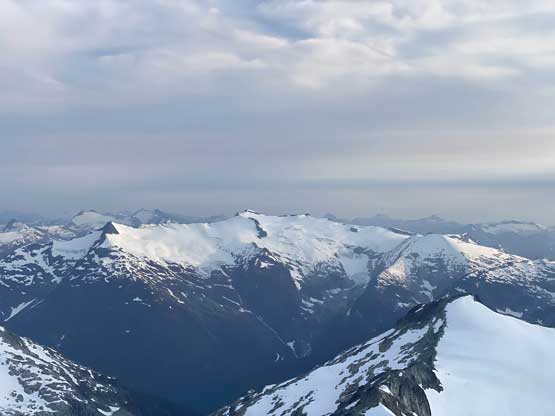 This particular window wasn’t 100% neither on the first day, but we had been refreshing the Whistler webcams for every hour in the morning and determined the cloud ceiling was well above the peaks’ level. We finally pulled the trigger at around noon giving me only 2 hours to scramble to pack up and buy some food. By 5 pm all five of us, Alex, Winnie, Sean and Nathan grouped at the Squamish airport and half an hour later we were boarding the chopper. Among five of us, Alex only needed Porterhouse Peak but was happy to repeat Ashlu Mountain. The rest of us needed all three peaks. It’s also my first time meeting Nathan Spowage after talking to him for a couple months, Nathan is much faster and climbs much harder rock than I can ever do, but more importantly, he is a rare one that possesses time, money and energy at the same time so I’m very glad to link up with him. Winnie had joined me on the Judge Howay mission and had undergone the whole Ashlu’s waiting game, and for Sean, we did Cayoosh Point together last year in November. For both Sean and Nathan this was their first time flying in a helicopter. As always, the flight itself was the first highlight of this trip as we basically flew over Ashlu-Elaho Divide with unobstructed views. We landed at around 2300 m on a snowy col right at the base of Porterhouse’s summit block leaving us only half an hour’s work to the first peak.