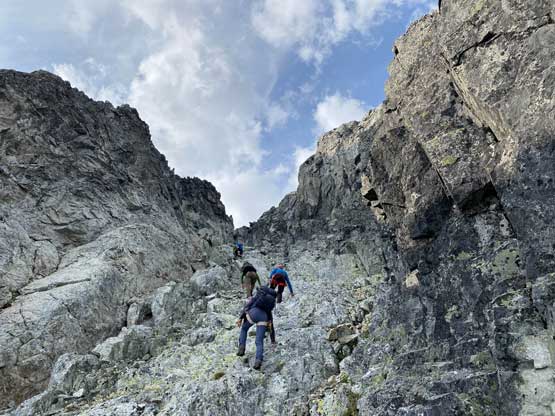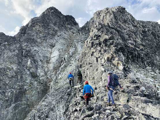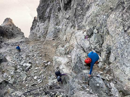 Before going for Porterhouse Peak we spent some time setting up camp and laying out the luxuries including camping chairs, water jugs, T&T sushi, Aloe Vera, canned tuna and all kinds of shits that shouldn’t even appear in the backcountry. We felt quite privileged to bring them into this remote zone. And because this was a a heli camp we decided to bring a 60m rope and some rock gears for Porterhouse Peak, even though we ended up not needing any. The standard route via South Gully wasn’t very clear in this online world that we couldn’t tell the exact technical difficulty. I asked quite a few locals that I thought would know a bit more, but to no avail. Traversing into the south gully was pretty straightforward. We easily bootpacked to the base of the route and ditched our snow gear there. There was some talus and scree and one exposed ledge to get into the gully. The scrambling inside the gully was surprisingly easy but the rocks were loose and we had to be extra careful in a group of five.