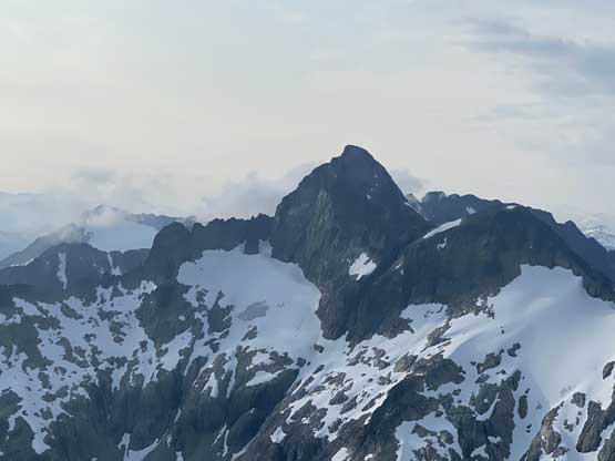 Porterhouse Peak is a fairly obscured summit on the far side of Ashlu-Elaho Divide. It does boast an iconic profile but is overshadowed by the taller neighbour, Ashlu Mountain. I’m sure this peak has been done more often than I thought over a decade or so ago when the roads in Ashlu Creek valley was still driveable. In the old times one could drive to pretty much the base of this peak but nowadays the road’s deactivated, leaving 23 km of walking with at least a few troublesome creek crossings just to reach the old “trail-head”. In particular the crossing of Pykett Creek was bridged by a few pieces of alders and there’s no guarantee whether or not the “bridge” would still be there. It’s not an impossible mission, but definitely sounds complicated and uncertain. This area had been eluding me for a couple years but the uncertainty in access had always kept me away from even attempting a trip there. I wanted to bag Ashlu Mountain, Porterhouse Peak and Amicus Mountain in one trip but I also didn’t like to spend 4-5 summer days just for these peaks. It’s a cool area, but not cool enough for that.