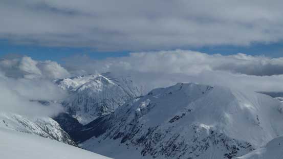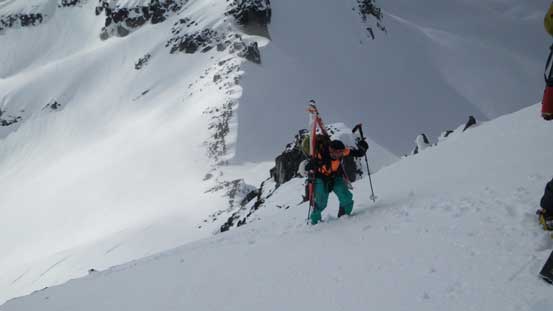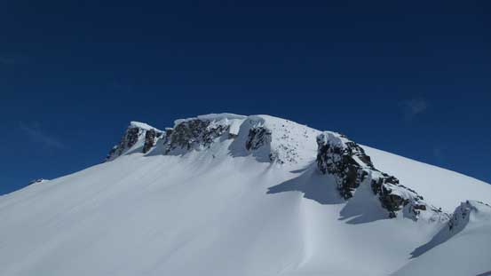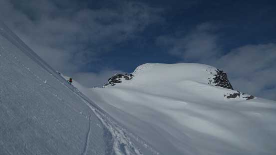 The initial 100 m or so elevation gain from Sphinx Pass was the crux – 40 degree or so and fairly sustained. The surface had turned slushy thank to the solar radiation but still, we could manage to skin most of the way up by some tight kick-turns. At one point I touched a spot where the top layer started to slide and offered literally no grip, and here’s where we all switched to boot-packing, but once this slope was cleared we put the skis back on again. The rest of the ascent to the summit was a pure slog and unfortunately we were engulfed in clouds.