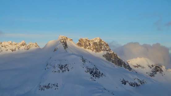 The Sphinx is a striking objective guarding the famous Garibaldi Lake from its “backside”. The most common approach is by crossing the frozen Garibaldi Lake in winter/spring on skis. The standard route via SW Ridge from Sphinx Pass is nothing technical, but does involve some steep snow climbing.