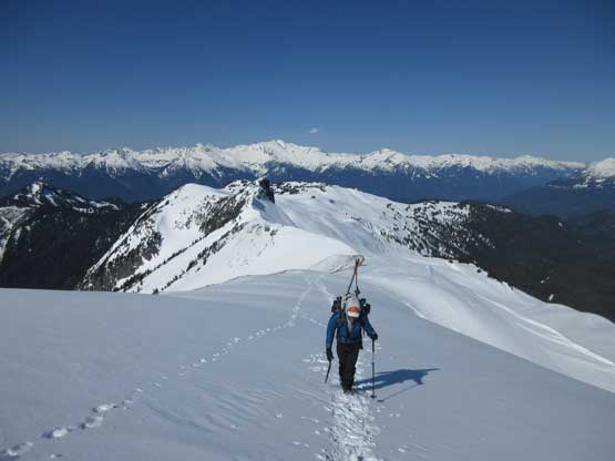 It’s apparent that I forgot about the amount of up-and-downs along Brohm Ridge, but despite that the views were very inspiring so our spirits were high. The peak looked to be close but actually still very far away. There were several major descents while traversing Brohm Ridge and we had to constantly make route-finding decisions. For the initial few dips we opted for the “down and up” option but upon reaching the biggest dip we opted for climbing up and over “Brohm Pinnacle” for some variation. The traverse over the pinnacle was more difficult than what I remembered from three years ago, probably due to the lack of snow in this year. We all had to take the snowshoes and skis off and Mel and I even strapped crampons on. The exposure was pretty real. The snowpack leading up onto Warren Glacier was crusty and icy so after a while the skiers all transitioned into boot-packing (on crampons), but halfway up the foreshortened slope they all went back into skinning. For Mel and I the game was simply “putting one foot in front of another” as snowshoeing required much fewer transition.