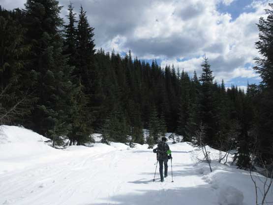 After carefully down-climbed the south ridge I strapped snowshoes back on and leisurely walked back to where we parted from each other. The others had just made the summit of Mt. Garibaldi and I pulled the stove out to melt some snow. This was part of the game’s plan because we could save some weight this way as a group. After a short while I watched Jake, Fletcher and Tyler flying down the NE Face of Garibaldi on their skis and snowboards and continuing down North Pitt Glacier. We decided to descend separately so that we wouldn’t hold each other back. About 15 minutes later Mel joined me and after a short break we had to focus on the long return hike. The plunge down and around onto Warren Glacier was fast and fun but soon we had to face that never-ending undulating game. Instead of traversing back over the pinnacle we opted for the bypass option. After that we decided to stick to the ridge and if for nothing, we could see more from the ridge… Further down along Brohm Ridge we stuck on skier’s left side-hilling a long stretch to join the main snowmobile’s road/track heading down for the cabin. Had we been there 10 minutes earlier we probably could have caught a ride down by snowmobilers but we got there too late. We saw nobody else on the descent, but that also meant we could soak the whole experience in. Mel led a blistering pace on the whole descent and I had to give everything I had in order to keep up the pace. I think we took only 1 short break and a few gear transitions.