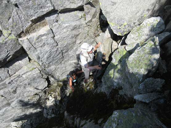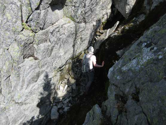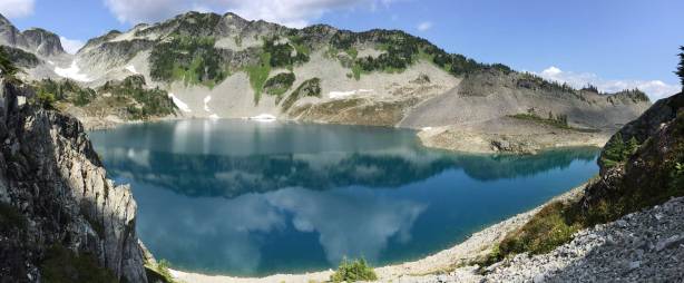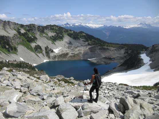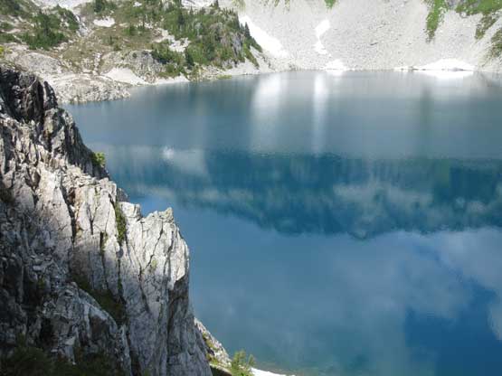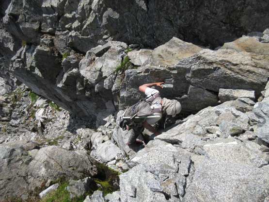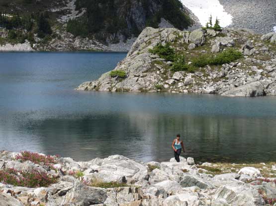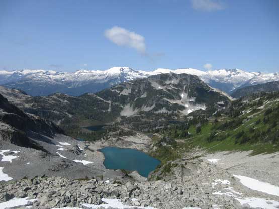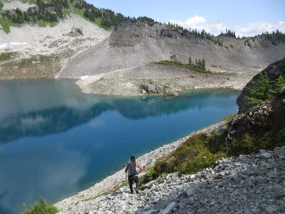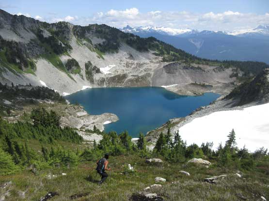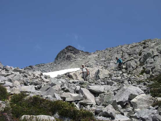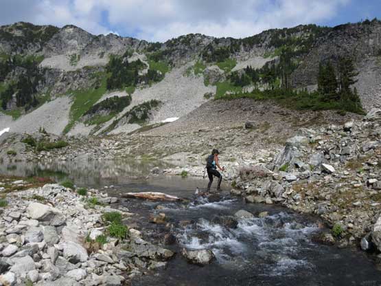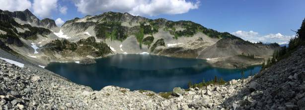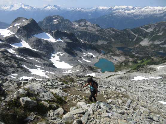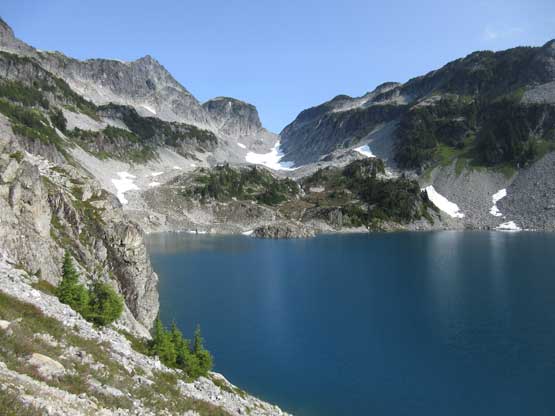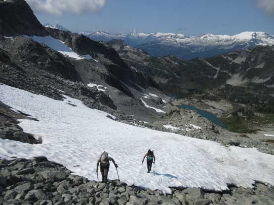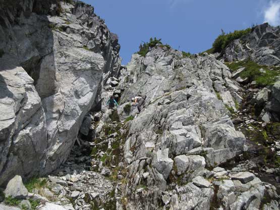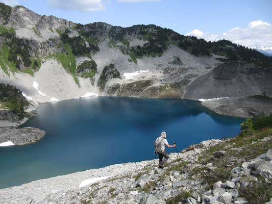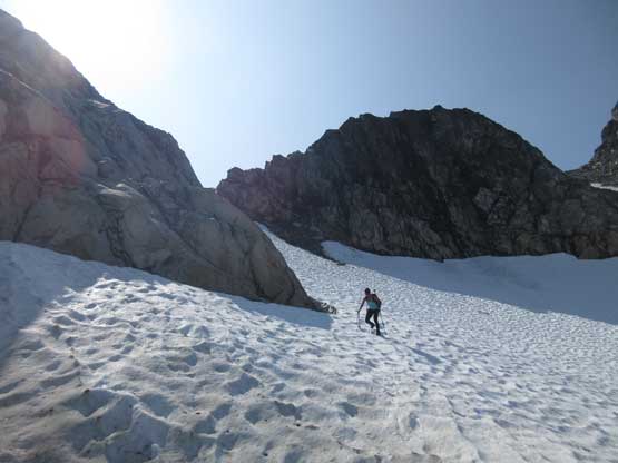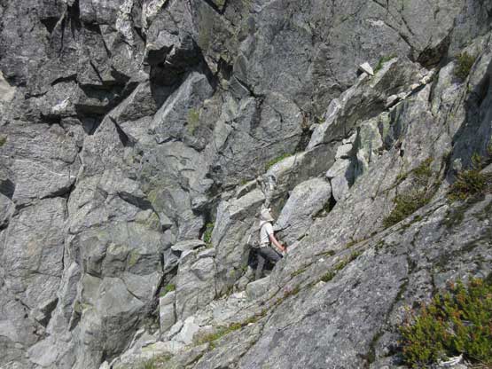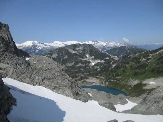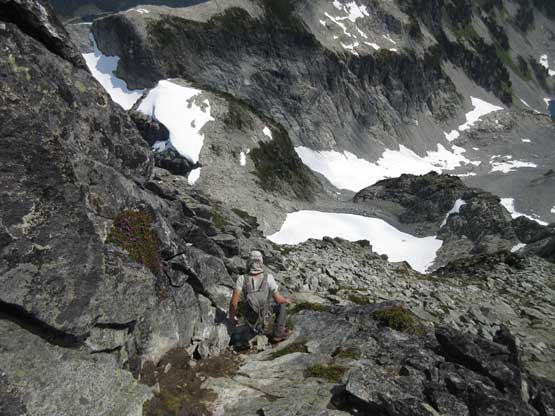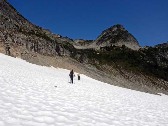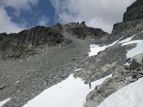 The ascent from High Falls Lake to a notch on Tricouni’s long south ridge was tougher than I thought. First of all we had to hop across the lake’s outflow stream. We barely got it done without wetting the boots. Then it appeared we couldn’t just traverse around the west shore of High Falls Lake and had to start a side-hilling rising traverse with a lot of scrambling on unstable talus. The upper section to gain the notch required some steep grass and (thankfully) some firm patches of snow to ease the travelling difficulties. At the notch I wasn’t sure where exactly to go and opted to cut high across the west side. This led me onto some wet and exposed 4th class slabs so turned around shortly after. The only other way was to descend some (firm) snow and traverse at a bench about 30 vertical meters lower than the notch. The snowfield was barely doable without crampons.