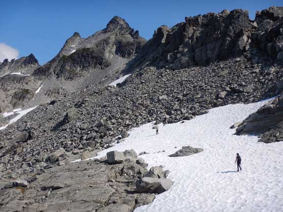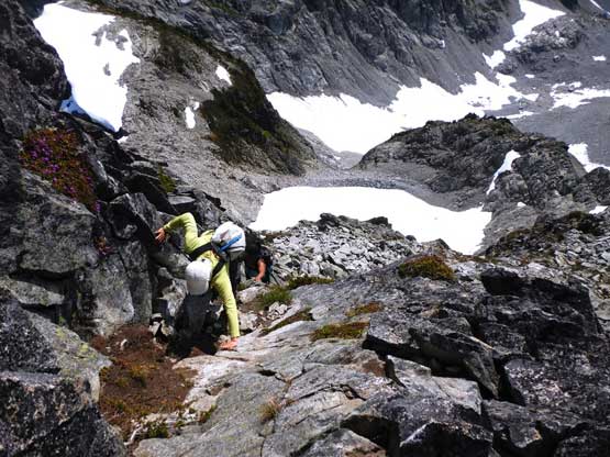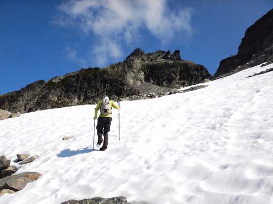 The ascent from High Falls Lake to a notch on Tricouni’s long south ridge was tougher than I thought. First of all we had to hop across the lake’s outflow stream. We barely got it done without wetting the boots. Then it appeared we couldn’t just traverse around the west shore of High Falls Lake and had to start a side-hilling rising traverse with a lot of scrambling on unstable talus. The upper section to gain the notch required some steep grass and (thankfully) some firm patches of snow to ease the travelling difficulties. At the notch I wasn’t sure where exactly to go and opted to cut high across the west side. This led me onto some wet and exposed 4th class slabs so turned around shortly after. The only other way was to descend some (firm) snow and traverse at a bench about 30 vertical meters lower than the notch. The snowfield was barely doable without crampons.