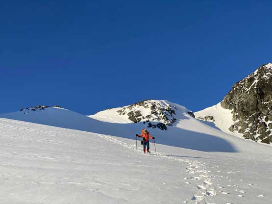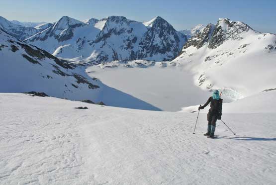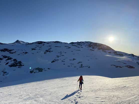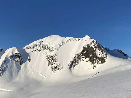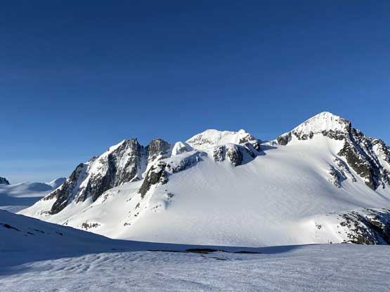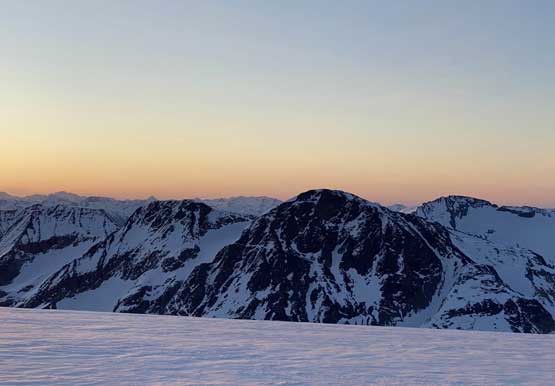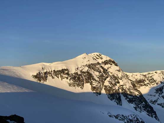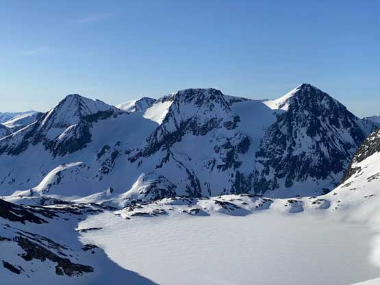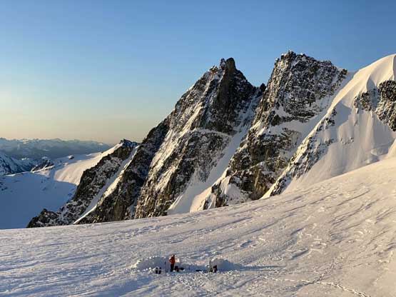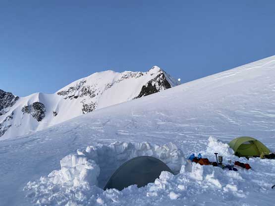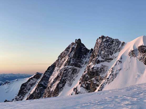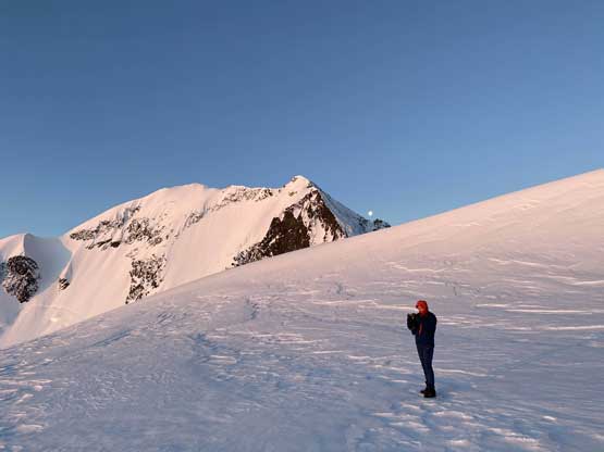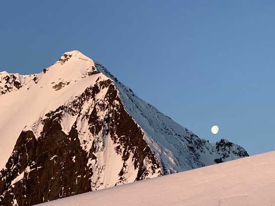 In the morning we again, woke up at 4:30 am, cooked breakfast at dawn and watched sunrise while breaking camp. It was a very cold morning so the going was slow. Once ready we traversed to the shoulder on Mt. Moe’s east ridge and dropped onto the steep glacier on the north side of Mt. Moe. I had remembered seeing crevasses on this glacier from my first trip to Mt. Moe a few years ago, but at this time of a year we observed nothing that indicated we were actually on a glacier. The glacier was pretty steep though, like 35 degrees for a long while, but the snow held off nicely all the way to the low point. From there we ascended up and over a bump to a lake basin south of Ure Peak’s multiple summits. The lake was completely frozen but appeared to have a ton of unnecessary elevation drop, so we opted to contour around which sucked big time with non-stopping side-hilling on snowshoes, and on firm snow.