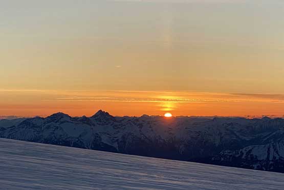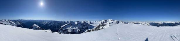 The view especially looking back at Weart Glacier was unbelievable so despite the cold wind we still took a long break on the summit. After having enough fun we easily retraced our steps back across the summit ridge and plunged back to our snowshoes. We had an option to descend all the way to the lake and then re-ascend but opted to retrace the tracks across the never-ending side-hilling. Thankfully the snow had softened up now meaning the snowshoeing wasn’t as painful as in the morning.