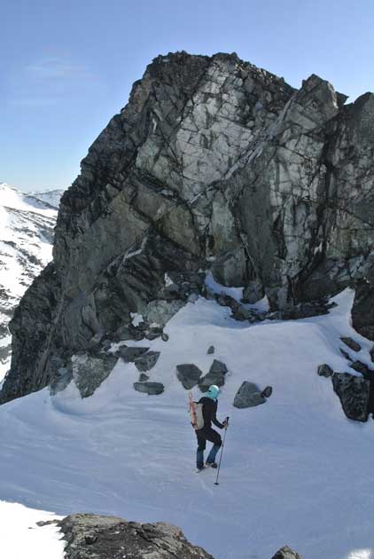 We found nice flat spot underneath a rock wall on the north side of the lake to take snowshoes off. The traverse to the col south of Ure Peak appeared to require ice axe and crampons. The snow was shitty at places but averagely speaking the condition was firm. After the steep grunt to the south side col we found finally see the few potential summit routes ahead. To avoid that unknown notch we would have to down-climb a steep east-facing slope backed under the sun for a couple hours already, and then re-ascend another steep south-facing gully. We said no to that and opted to embrace the unknown. We ditched snowshoes and easily boot-packed to the west ridge and traversed across some loose rocks to that notch. It was not bad at all with only a couple 3rd class moves. After that we ditched crampons and easily plodded to the summit, which was farther than we thought.