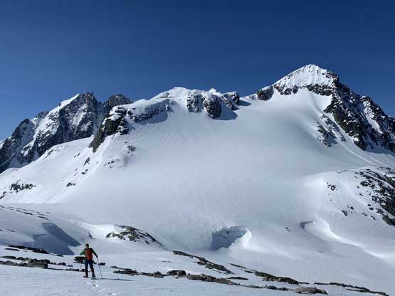 In the morning we again, woke up at 4:30 am, cooked breakfast at dawn and watched sunrise while breaking camp. It was a very cold morning so the going was slow. Once ready we traversed to the shoulder on Mt. Moe’s east ridge and dropped onto the steep glacier on the north side of Mt. Moe. I had remembered seeing crevasses on this glacier from my first trip to Mt. Moe a few years ago, but at this time of a year we observed nothing that indicated we were actually on a glacier. The glacier was pretty steep though, like 35 degrees for a long while, but the snow held off nicely all the way to the low point. From there we ascended up and over a bump to a lake basin south of Ure Peak’s multiple summits. The lake was completely frozen but appeared to have a ton of unnecessary elevation drop, so we opted to contour around which sucked big time with non-stopping side-hilling on snowshoes, and on firm snow.